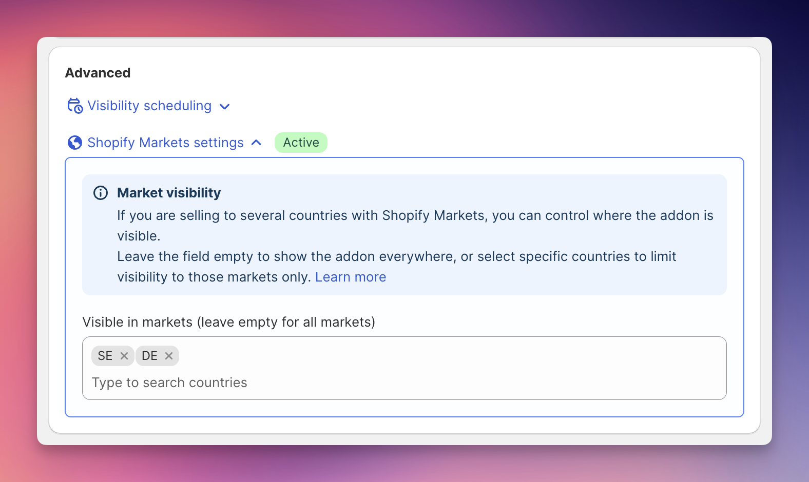 Set visibility in Shopify Markets | Set addon visibility in EliteCart | |