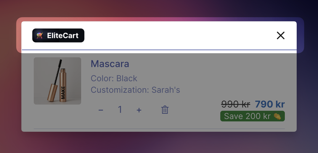Replace the default EliteCart header (which shows the title "Cart" and a close button) with a custom header that displays your store's logo. This gives the cart drawer a more branded, premium feel that matches the rest of your storefront.